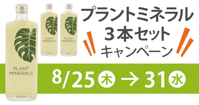 しかしながら、夏場は汗と一緒に体内のミネラルが排出されてしまい、いつも以上に体がミネラルを必要とする時期であるということを鑑みて、本日より「ゲリラキャンペーン」として、8月31日までの1週間《プラントミネラル3本セット》キャンペーンを実施させていただきます!